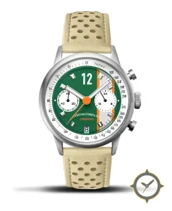 A Chronograph watch with a bold 42.5mm presence on the wrist, crafted from stainless steel featuring a green dial with a unique smooth lacquer finish.