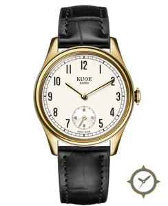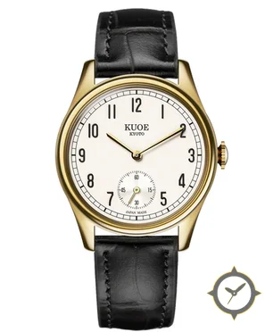 A Dress watch with a vintage-inspired 32mm case, crafted from gold featuring a white dial with a unique matte finish.