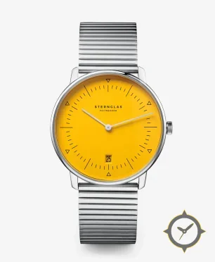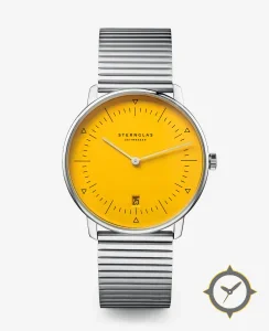 A Minimalist watch with a versatile 40mm case, that suits most wrists, crafted from stainless steel featuring a yellow dial with a unique smooth lacquer finish.