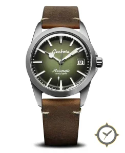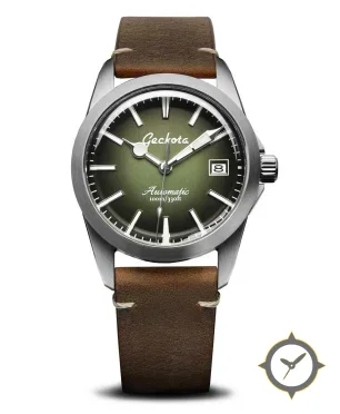 A Field watch with a vintage-inspired 29mm case, crafted from stainless steel featuring a green dial with a unique sunburst finish.