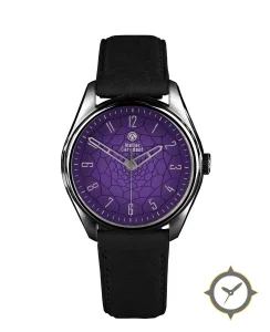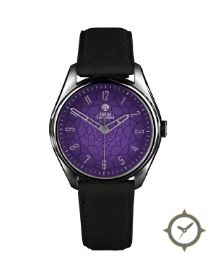 A Dress watch with a vintage-inspired 34mm case, crafted from stainless steel featuring a purple dial with a unique matte with printed geometric/web mosaic texture finish.