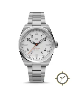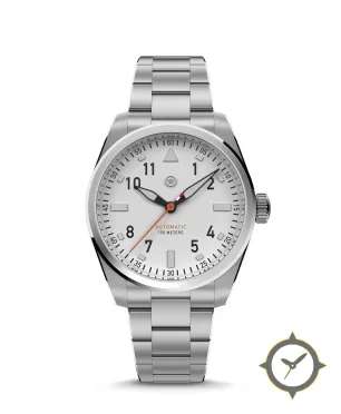 A Pilot watch with a bold 41.5mm presence on the wrist, crafted from stainless steel featuring a white dial with a unique matte finish.