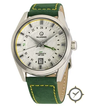A GMT watch with a vintage-inspired 35.5mm case, crafted from stainless steel featuring a white dial with a unique mother-of-pearl textured finish and a true GMT complication for tracking a second time zone.