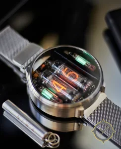 A Vintage watch with a bold 54mm presence on the wrist, crafted from stainless steel featuring a black dial with a unique exposed electronic components under a domed crystal finish.