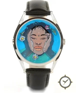 A Minimalist watch with a vintage-inspired 36.5mm case, crafted from stainless steel featuring a turquoise dial with a unique glossy printed illustration (lacquered) finish.