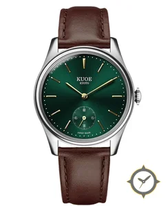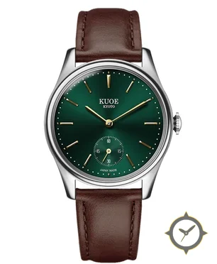 A Dress watch with a vintage-inspired 34.5mm case, crafted from stainless steel featuring a green dial with a unique sunburst (radial) finish.