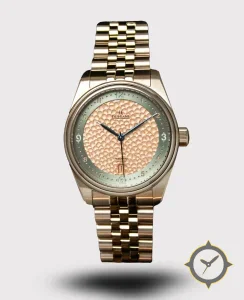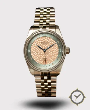 A Dress watch with a bold 44mm presence on the wrist, crafted from bronze featuring a orange dial with a unique hammered/pebbled texture (textured center) finish.