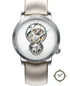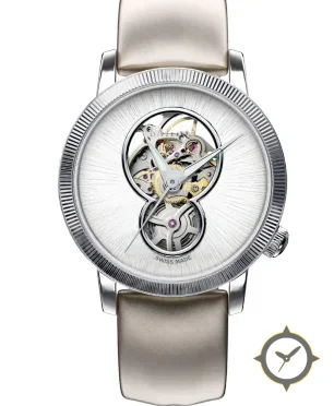 A Skeleton watch with a vintage-inspired 34.5mm case, crafted from stainless steel featuring a white dial with a unique radial sunburst / guilloché finish.