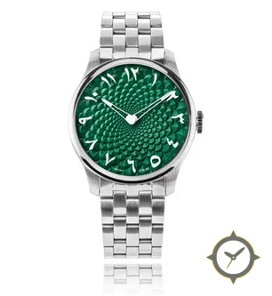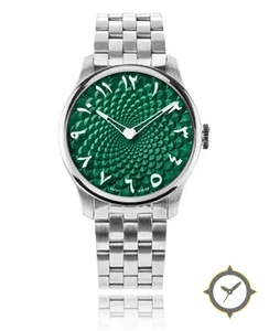 A Dress watch with a vintage-inspired 34mm case, crafted from stainless steel featuring a green dial with a unique radial guilloché / spiral texture finish.