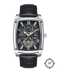 A Luxury watch with a vintage-inspired 35.5mm case, crafted from stainless steel featuring a black dial with a unique textured guilloche with vertical stripes and sunburst elements finish and a beautiful moonphase display.