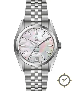 A Dress watch with a versatile 39.5mm case, that suits most wrists, crafted from stainless steel featuring a white dial with a unique mother-of-pearl (iridescent) finish.