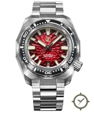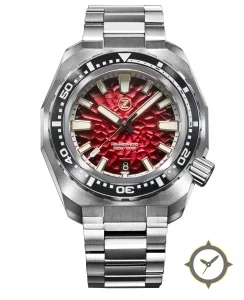 A Dive watch with a bold 52mm presence on the wrist, crafted from stainless steel featuring a red dial with a unique hammered / guilloché wave (textured hammered finish) finish.