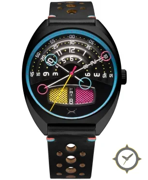 A Racing watch with a versatile 38.5mm case, that suits most wrists, crafted from stainless steel featuring a black dial with a unique concentric rings with dotted markers finish.