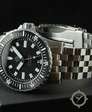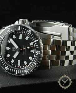 A Dive watch with a vintage-inspired 34.5mm case, crafted from stainless steel featuring a black dial with a unique matte finish.