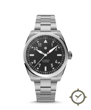 A Pilot watch with a versatile 40mm case, that suits most wrists, crafted from stainless steel featuring a black dial with a unique matte finish.