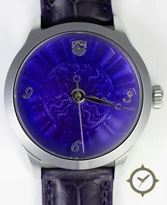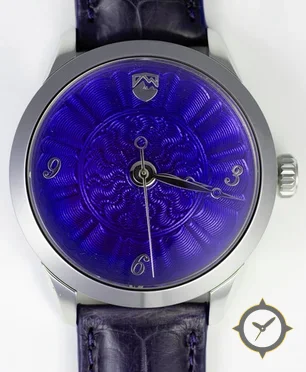 A Dress watch with a vintage-inspired 32.5mm case, crafted from stainless steel featuring a purple dial with a unique guilloché (engine-turned) finish.