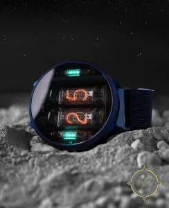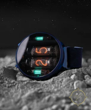 A Digital watch with a bold 58.5mm presence on the wrist, crafted from Coating featuring a black dial with a unique transparent/see-through showing nixie tube elements finish.
