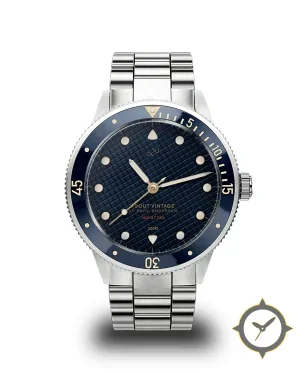 A Dive watch with a vintage-inspired 33.5mm case, crafted from stainless steel featuring a blue dial with a unique waffle / cross-hatch textured finish finish.