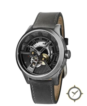A Skeleton watch with a bold 46mm presence on the wrist, crafted from stainless steel featuring a black dial with a unique open-work skeleton with ribbed lower section and textured segmented ring finish.