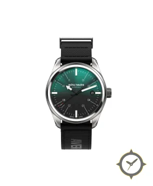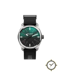 A Field watch with a bold 43.5mm presence on the wrist, crafted from stainless steel featuring a green dial with a unique sunburst gradient (ombré) finish.