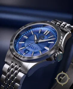 A Sports watch with a bold 47.5mm presence on the wrist, crafted from stainless steel featuring a blue dial with a unique metallic guilloché / sunburst texture finish.