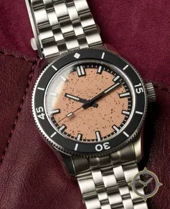A Dive watch with a bold 45.5mm presence on the wrist, crafted from stainless steel featuring a orange dial with a unique speckled/granite-like texture with irregular dark flecks finish.