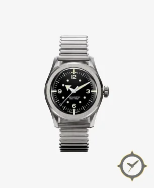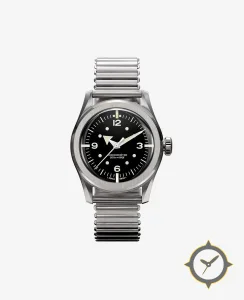 A Military watch with a vintage-inspired 36.5mm case, crafted from stainless steel featuring a black dial with a unique matte finish.