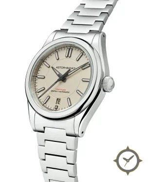 A Sports watch with a vintage-inspired 34.5mm case, crafted from stainless steel featuring a white dial with a unique matte (lightly grained / sandblasted) finish.