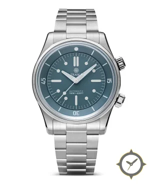 A Dive watch with a bold 44.5mm presence on the wrist, crafted from stainless steel featuring a blue dial with a unique matte finish.