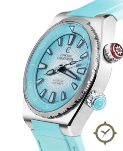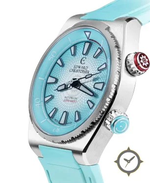 A Dive watch with a vintage-inspired 33.5mm case, crafted from stainless steel featuring a turquoise dial with a unique guilloche finish.