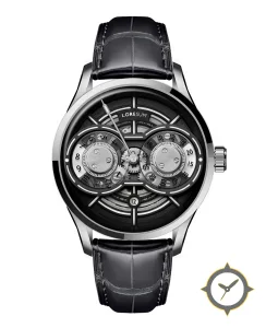 A Skeleton watch with a bold 49mm presence on the wrist, crafted from stainless steel featuring a black dial with a unique open-worked / skeletonized, multi-layered finish.
