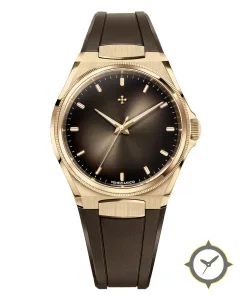 A Luxury watch with a vintage-inspired 33mm case, crafted from gold featuring a brown dial with a unique sunburst finish.