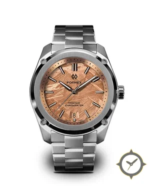 A Sports watch with a vintage-inspired 35.5mm case, crafted from stainless steel featuring a brown dial with a unique metallic textured (copper/rose) with a meteorite/hammered finish finish.