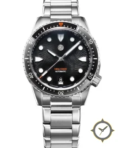 A Dive watch with a vintage-inspired 32mm case, crafted from stainless steel featuring a black dial with a unique sunburst swirl texture finish.