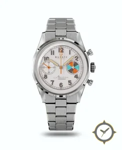 A Chronograph watch with a vintage-inspired 36mm case, crafted from stainless steel featuring a white dial with a unique matte finish.