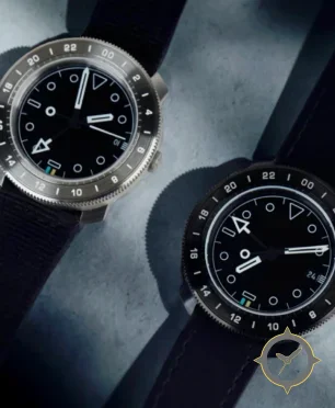 A GMT watch with a vintage-inspired 32.5mm case, crafted from stainless steel featuring a black dial with a unique matte finish and a true GMT complication for tracking a second time zone.