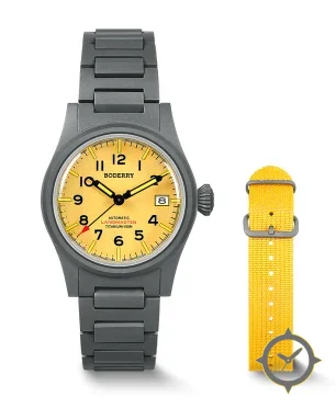 A Field watch with a vintage-inspired 31mm case, crafted from titanium featuring a yellow dial with a unique grainy/textured finish.