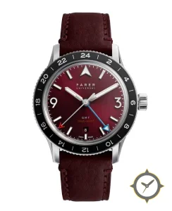A GMT watch with a vintage-inspired 37.5mm case, crafted from stainless steel featuring a crimson dial with a unique sunburst radial gradient finish and a true GMT complication for tracking a second time zone.