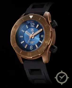 A Dive watch with a versatile 39.5mm case, that suits most wrists, crafted from bronze featuring a blue dial with a unique sunburst finish.