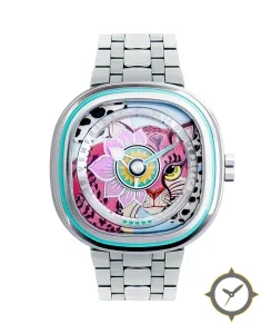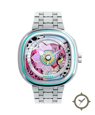 A Dress watch with a versatile 38.5mm case, that suits most wrists, crafted from stainless steel featuring a purple dial with a unique printed/painted illustration finish.