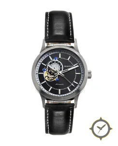 A Skeleton watch with a bold 43mm presence on the wrist, crafted from stainless steel featuring a black dial with a unique matte finish.