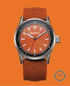 A Field watch with a versatile 40mm case, that suits most wrists, crafted from stainless steel featuring a orange dial with a unique waffle (square grid) finish.