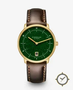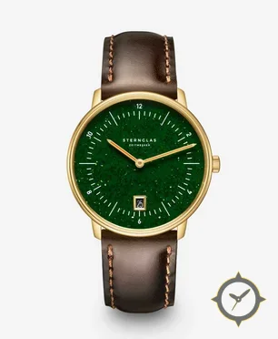 A Minimalist watch with a bold 41.5mm presence on the wrist, crafted from gold featuring a green dial with a unique speckled / stone-like (granite) finish finish.