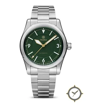 A Field watch with a vintage-inspired 35.5mm case, crafted from stainless steel featuring a green dial with a unique matte finish.