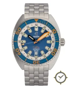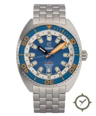 A Dive watch with a bold 43mm presence on the wrist, crafted from stainless steel featuring a blue dial with a unique sunburst finish.