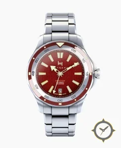 A Dive watch with a bold 45.5mm presence on the wrist, crafted from stainless steel featuring a red dial with a unique textured woven / basketweave finish.