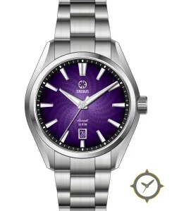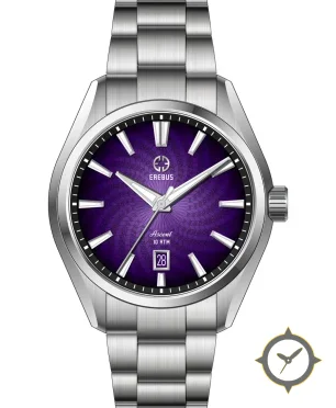 A Sports watch with a versatile 38.5mm case, that suits most wrists, crafted from stainless steel featuring a purple dial with a unique radial guilloché with a textured geometric spiral finish.