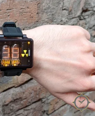 A Digital watch, crafted from Coating featuring a black dial with a unique exposed electronics / nixie tubes finish.