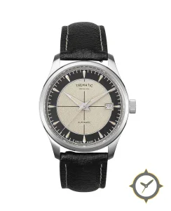 A Vintage watch with a bold 43mm presence on the wrist, crafted from stainless steel featuring a white dial with a unique grained/sandblasted finish.