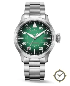 A Pilot watch with a vintage-inspired 36mm case, crafted from stainless steel featuring a green dial with a unique sunburst gradient finish.